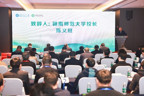陈义旺在致辞中代表赣南师范大学对与会的专家学者表示诚挚的欢迎,并就学校的历史沿革、科研平台,化学化工学院学科建设情况作系统介绍。