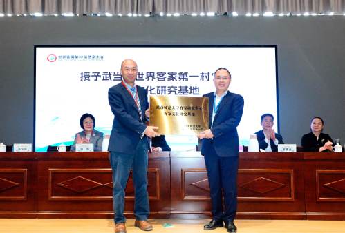 开幕式上,陈义旺代表学校为武当“世界客家第一村”客家文化研究基地授牌仪式。