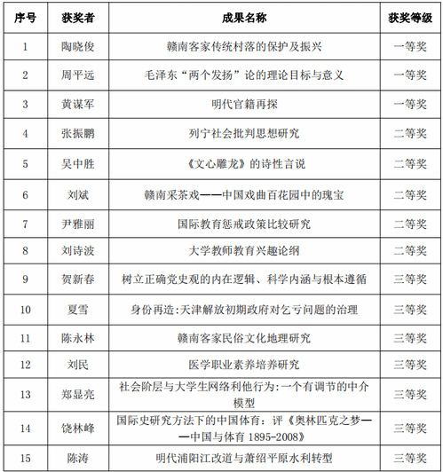 10月26日,江西省社会科学界联合会正式公布《关于公布江西省第二十次社会科学优秀成果奖获奖项目的通知》,我校共有15项成果获奖。其中一等奖3项、二等奖5项、三等奖7项,获奖数量与质量创历史新高。