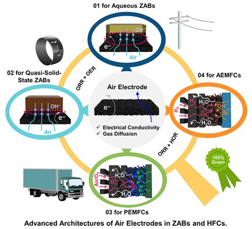 近日,我校陈义旺教授、李龙彬特聘教授团队在国际权威期刊《Advanced Materials》以《Advanced Architectures of Air Electrodes in Zinc–Air Batteries and Hydrogen Fuel Cells》为题发表论文,该论文对锌空气电池和氢燃料电池空气电极结构的最新进展进行综述研究,并对该领域未来发展方向进行预测。研究团队系统地揭示了液态锌空气电池、准固态锌空气电池、质子交换膜燃料电池和阴离子交换膜燃料电池的空气电极的微观反应界面到宏观传质的机理和局限性。赣南师范大学为论文第一完成单位,化学化工学院气体传感创新团队李龙彬博士为本文第一作者,陈义旺教授、南昌大学袁凯教授为本文的共同通讯作者。