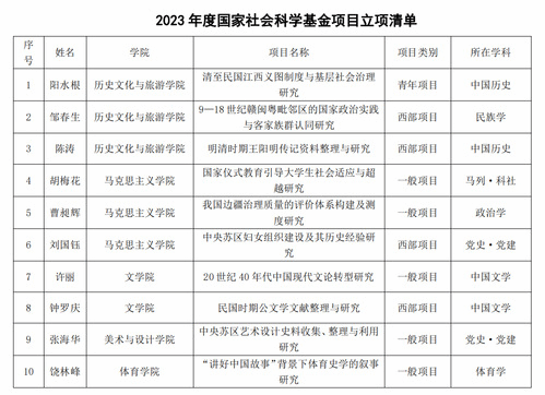 近日,全国哲学社会科学工作办公室公布2023年度国家社科基金年度项目立项清单,我校共有10个项目获批立项,其中一般项目5项、青年项目1项、西部项目4项,立项数位列全省高校第4。