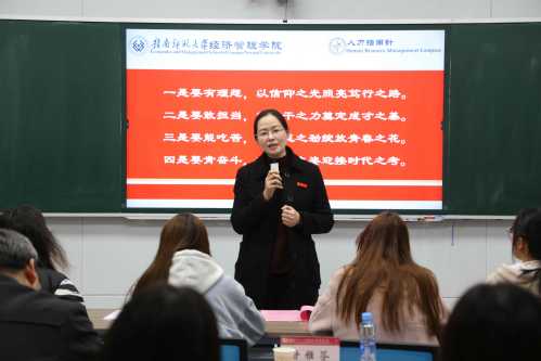 12月27日,校党委常委、副校长甘雅芬在一教505为经济管理学院学生上思政课,聚焦爱国主义教育引领青年学生在强国建设、民族复兴伟业中建功立业。经济管理学院负责同志一同参加。