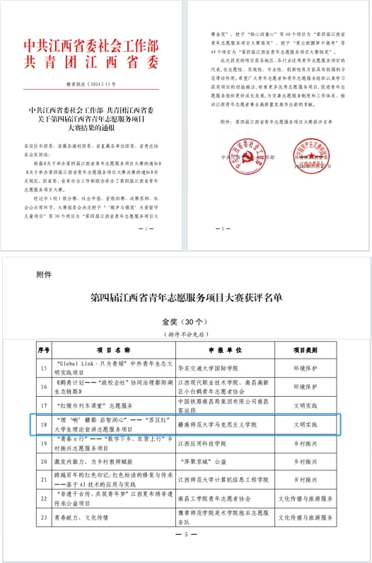 日前,由省委社会工作部、团省委共同主办的第四届江西省青年志愿服务项目大赛圆满落幕。经过市(校)级分赛、社会申报、省级初赛、决赛答辩、社会公示等环节,我校马克思主义学院指导的“理‘响’赣鄱 启智润心”——“苏区红”大学生理论宣讲志愿服务项目荣获金奖。