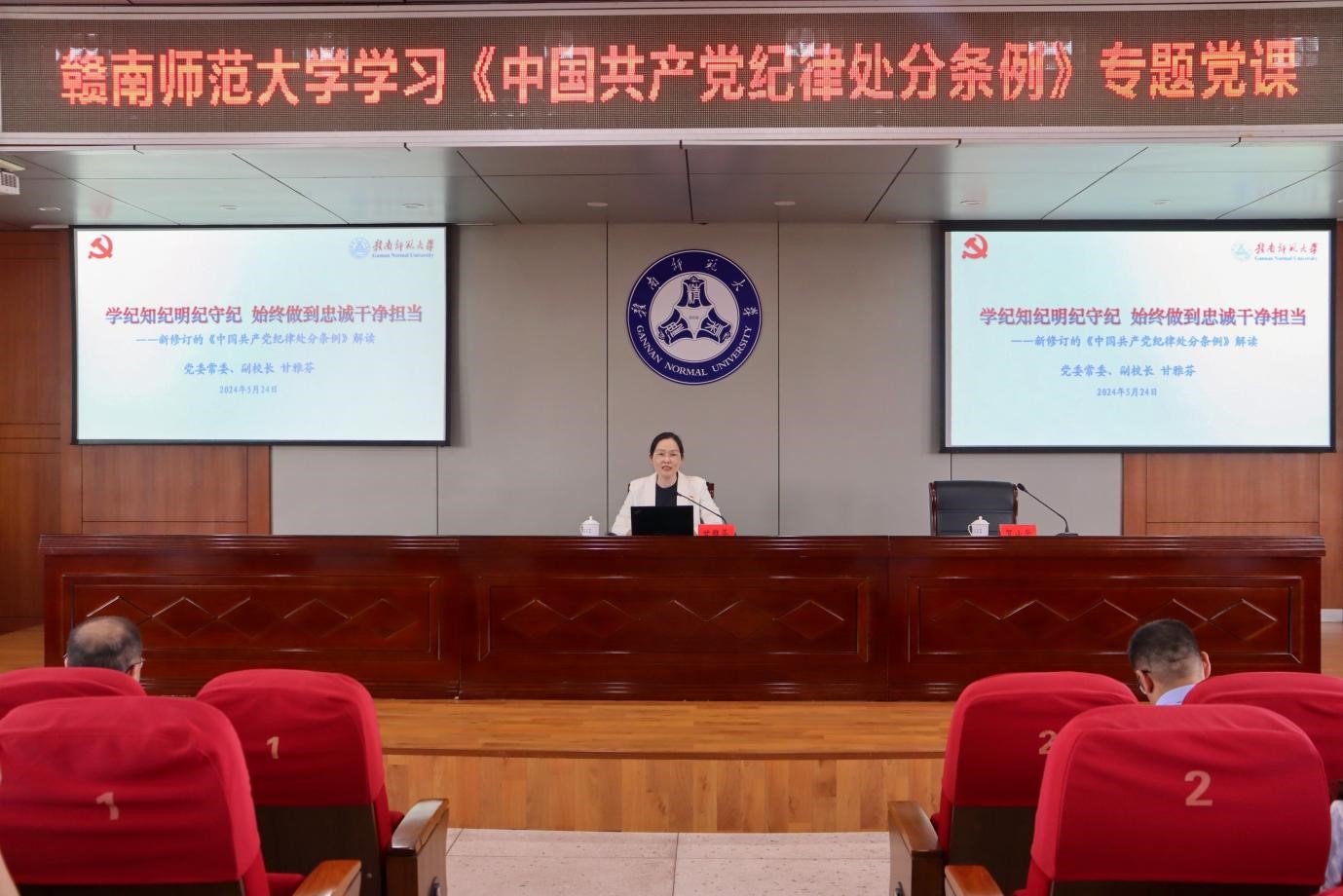 5月24日,校党委常委、副校长甘雅芬以《学纪知纪明纪守纪,始终做到忠诚干净担当》为题,为经济管理学院、数学与计算机科学学院党员讲授专题党课。相关学院负责同志,教师党员,所联系支部党员共计200余人参加。