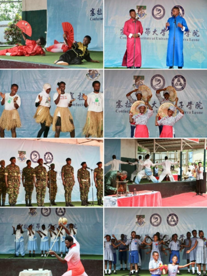 压轴环节文艺演出精彩不断,赢得掌声阵阵。既有塞大孔院特色的武术表演,相声节目《请您喝茶》,还有军事学院学员演绎的《一二三四歌》、弗拉湾学院附中学员的采茶舞、功夫茶表演与三字经诵读的巧妙结合、奈奈小学学员的歌曲《听我说谢谢你》等,最后独具塞拉利昂风情的草裙舞将演出推向了高潮。