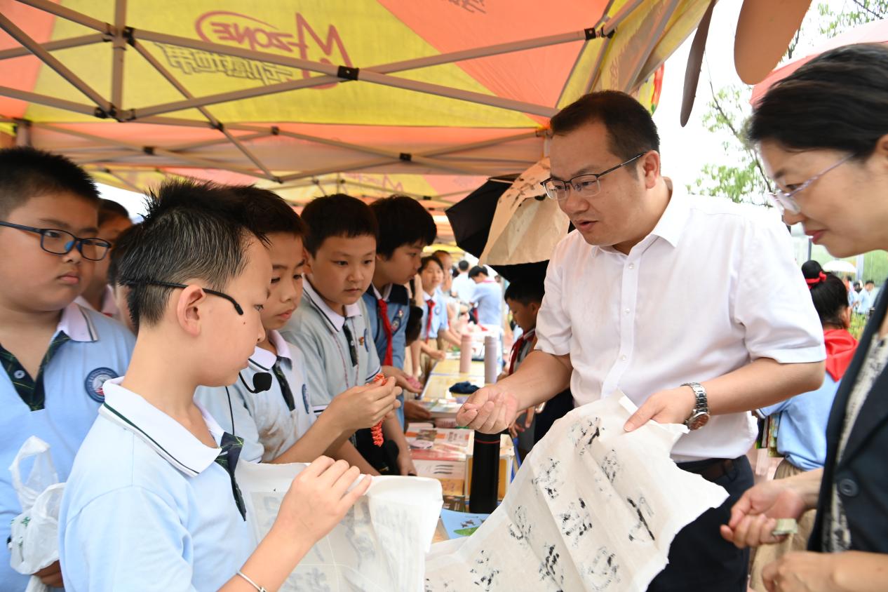 肖笃森先后来到附属蓉江小学、附属蓉江幼儿园和附属蓉江第二小学,参观了阅读和科技作品展示,参加了丰富多彩的“跳蚤市场”活动,观摩了生动有趣的科学实验秀。肖笃森与孩子们亲切交谈,参与游戏,与孩子们共同体验节日的快乐。