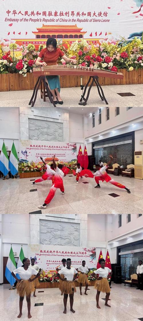 招待会上,我校塞拉利昂大学孔子学院师生为庆祝中华人民共和国成立74周年奉献精彩演出。志愿者教师古筝演奏《我和我的祖国》,以动人的音符诉说着对祖国的深切热爱。武术俱乐部学员带来武术和太极表演,一招一式打出了铮铮武魂。汉语学生献上塞拉利昂传统民族草裙舞,灵动的舞姿伴着激昂的鼓点,展现了塞拉利昂人民的热情与开放。文艺节目将招待会的气氛推向高潮,现场掌声雷动。