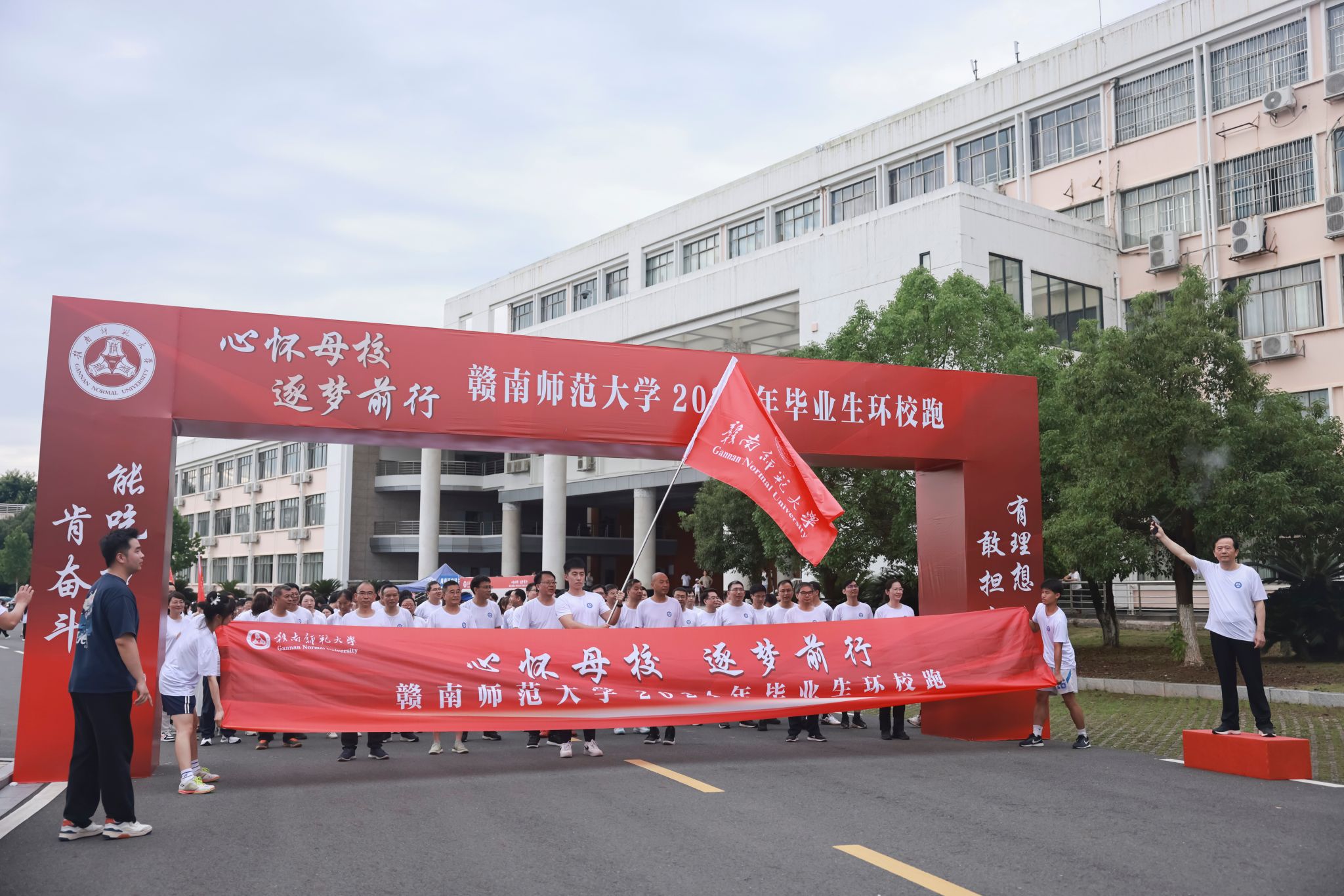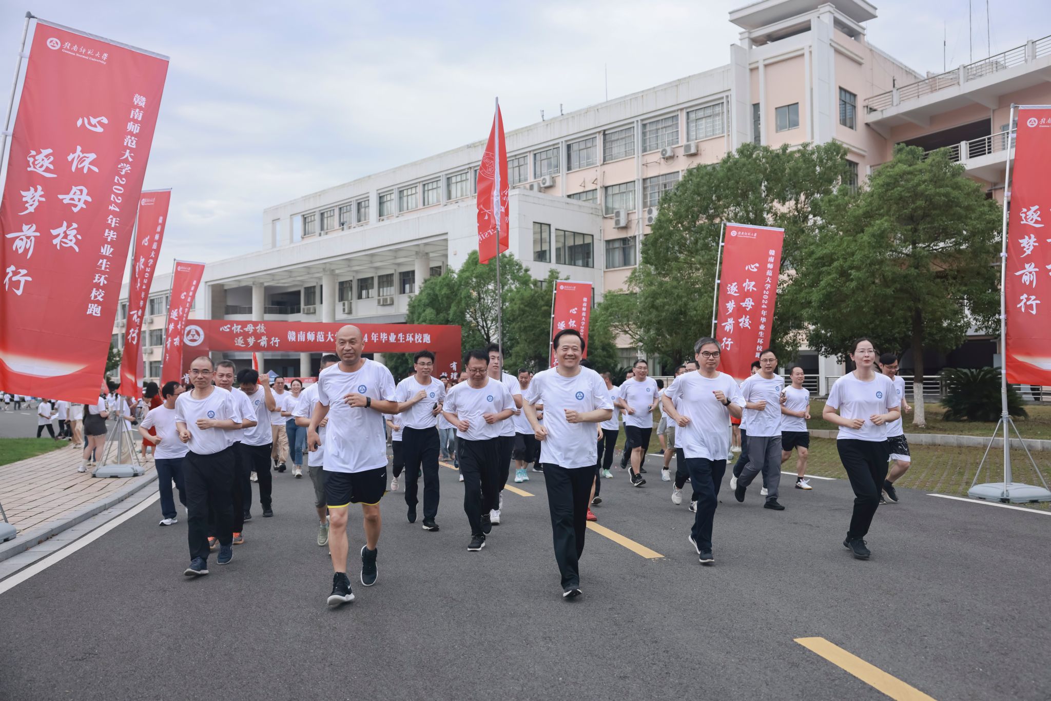 一次环校跑,一生赣师情。毕业生环校跑活动旨在激励全体毕业生永葆爱校荣校情怀,激发逐梦前行斗志,踔厉奋发,勇毅前行,在青春的赛道上奋力奔跑,争取跑出当代赣师青年的最好成绩。校党政办、党委学工部、校团委、教务处、研究生院、国际教育学院、图书馆、保卫处等部门负责同志以及各教学学院有关负责同志,毕业班辅导员、班主任参加。