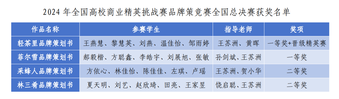 其中,由王苏洲、黄晖老师指导,王燕慧、黎慧英、刘燕、温佳怡、邹雨婷等同学参与的作品《轻茶里品牌策划书》成功晋级全国精英赛环节。