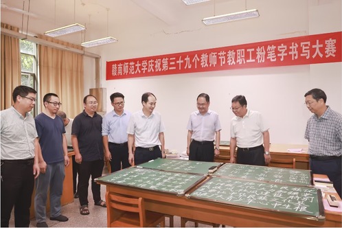 9月15日,学校在图书馆一楼举行“庆祝第39个教师节”教职工粉笔字书写比赛,党委副书记胡龙华,副校长吴磊到场观摩,校工会、教务处、信息与教育技术中心、图书馆负责同志陪同,100余名教职工参赛。