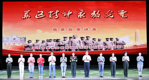 在聂耳剧场,《苏区精神永放光芒》红色情景故事讲演精彩上演。此次讲演由瑞金中央革命根据地纪念馆组织策划,以“弘扬苏区精神、赓续红色血脉”为主题,重点演绎了“红井情深”“一生守望”“十七棵松”等中央苏区时期的经典红色故事。演出充分运用深情讲演、情景再现、舞台特效、配乐渲染等多种艺术表现形式,并融入我校音乐学院师生创排的情景舞蹈《等着你》,沉浸式再现了中央苏区时期的峥嵘岁月。