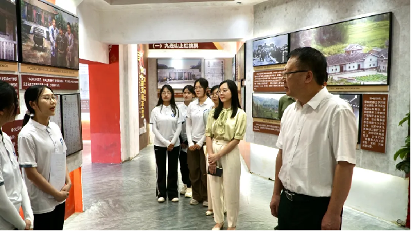 在龙南市武当镇大坝村,刘民与实践团师生亲切交谈,并一同参观了大坝游击队陈列馆。他勉励同学们说,“大家在开展红色寻访搜集红色资源的过程中,要深度提炼苏区精神的实质,深入洞悉民风民情,用心用情做好服务,努力在暑期社会实践活动中提升本领。”