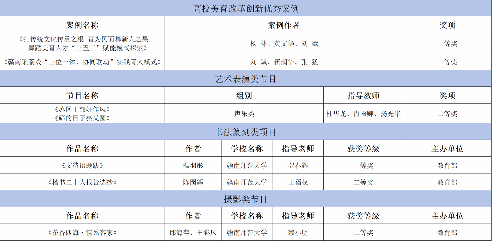 我校在高校美育改革创新优秀案例评选中获一等奖1项、二等奖1项,在书法篆刻类项目评选中获一等奖1项、二等奖1项,在摄影类项目评选中获二等奖1项,在艺术表演类项目评选中获二等奖1项,我校音乐学院教师杨林以《扎传统文化传承之根 育为民而舞新人之果——舞蹈美育人才“三五三”赋能模式探索》为题,在全国第七届大学生艺术展演活动高校美育改革创新优秀案例报告会中作案例分享。