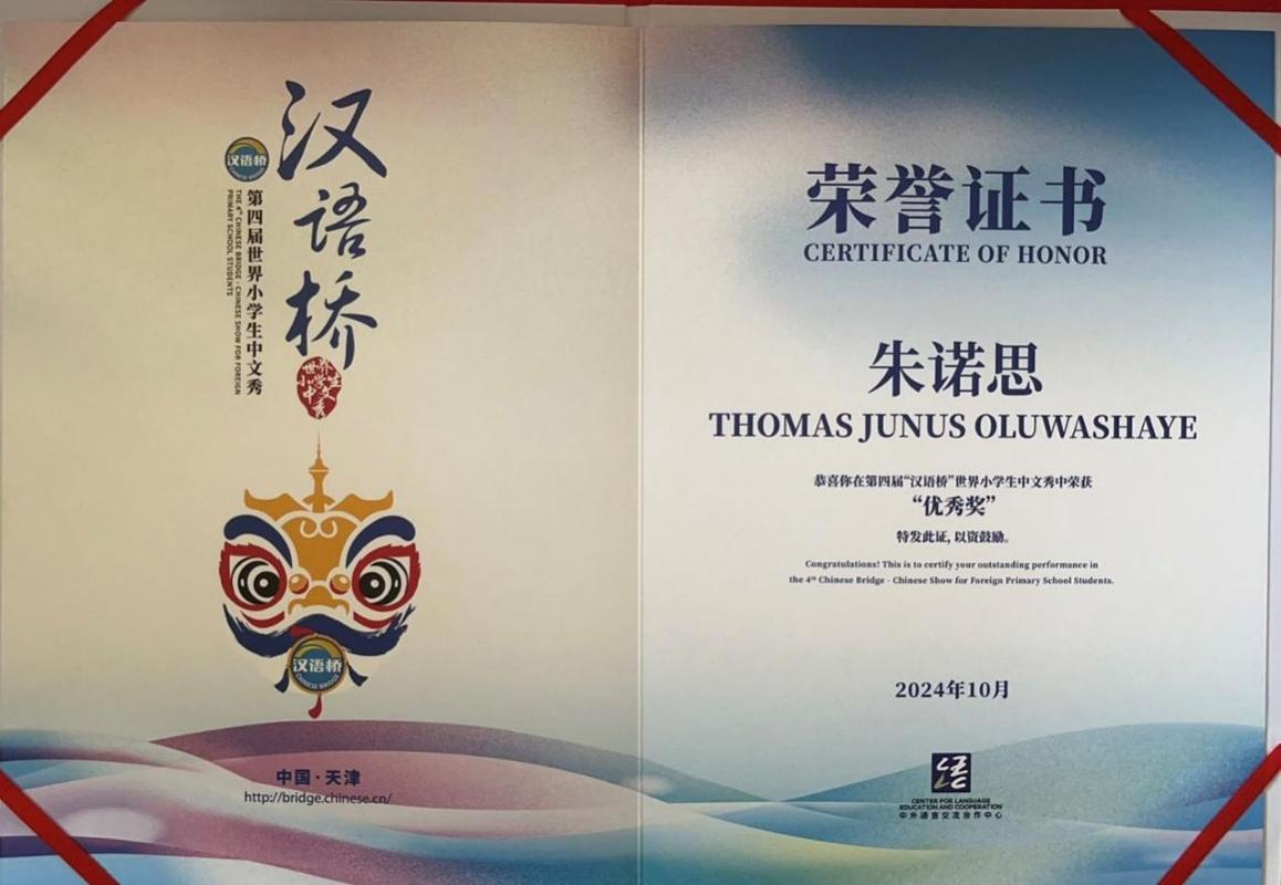 在10月结束的第四届“汉语桥”世界小学生中文秀总决赛中,来自塞拉利昂大学孔子学院下设教学点美国蒙特梭利小学Junus Thomas(朱诺思),与来自59个国家的68名小选手同台竞技。经过笔试、演讲、才艺展示、知识问答等层层角逐,以及在丰富多彩的文化体验活动中的不俗表现,Junus Thomas(朱诺思)最终荣获优秀奖。据悉,非洲赛区共有九名选手获得此奖项。