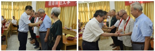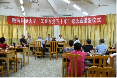 胡龙华在致辞中代表学校党委向荣获“光荣在党50年”纪念章的六位老党员表示热烈祝贺,同时向为党的教育事业、为赣南师范大学的建设发展贡献一生的老党员和老同志们致以崇高的敬意!
