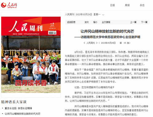 谢庐明围绕如何理解井冈山精神的内涵、江西在井冈山精神研究中所做的工作、井冈山精神对井冈山地区文旅事业的发展和人民群众的精神面貌的影响以及党员干部和普通群众学习井冈山精神的重要意义等方面的问题,接受了《人民周刊》记者的专访。在专访中,谢庐明教授介绍了我校中央苏区研究中心推出的井冈山精神和红色文化研究的著作和论文,以及中央苏区研究中心对深化井冈山历史和红色文化研究,弘扬井冈山精神,推动开发利用红色文化资源,促进革命老区社会经济发展所作出的努力。