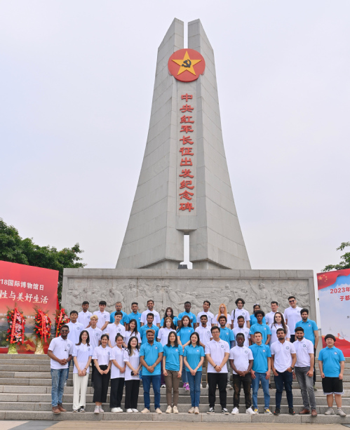 于都河畔,形如风帆的中央红军长征出发纪念碑巍然矗立。留学生们缓步绕行纪念碑,仔细察看基座上的浮雕,缅怀先烈。在长征渡口,一段浮桥漂立河中,大家驻足良久,深情聆听当年红军夜渡于都河的伟大壮举。随后,大家参观了中央红军长征出发纪念馆。一排由草鞋和五角星编排的新中国地图、锈迹斑斑的铁锅、绣花草鞋、破旧羊皮袄等吸引了留学生的强烈好奇心,在小小红领巾讲解员的讲述中,了解历史物件背后的感人故事。
