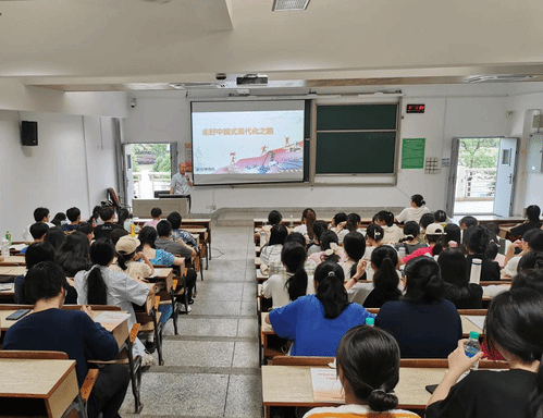 陈义旺从西方科技发展史出发,对比中国现代化发展的艰辛历程,旁征博引、案例丰富,为学生们讲述了中国为什么要走现代化道路、什么是中国式现代化道路、怎样走好中国式现代化道路三个重要问题。课上,陈义旺勉励学生们为中华之崛起而读书,努力成为国家的栋梁之才,为实现中国梦贡献力量。