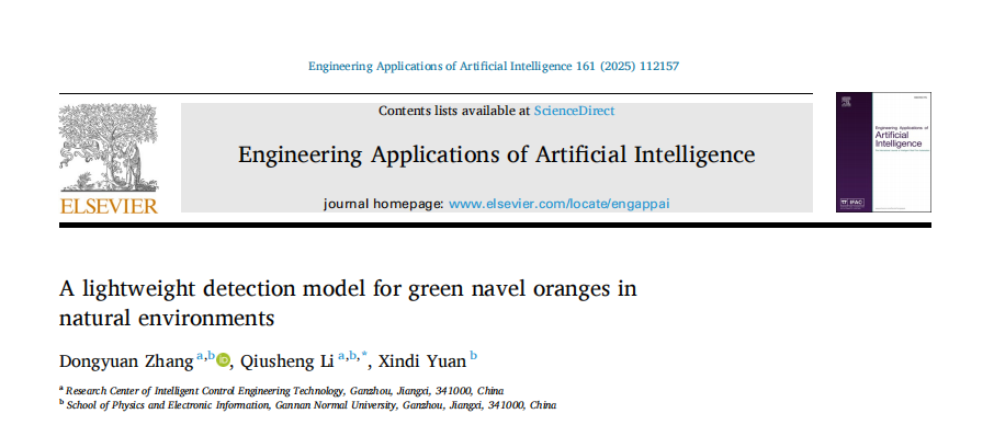 近日,2023级电子信息专业硕士研究生张东园以第一作者身份,在国际人工智能与工程交叉领域期刊《EngineeringApplicationsofArtificialIntelligence》(中科院一区TOP,IF=8.02)发表研究论文《ALightweightDetectionModelforGreenNavelOrangesinNaturalEnvironments》。导师李秋生教授为通讯作者,赣南师范大学为唯一完成单位。