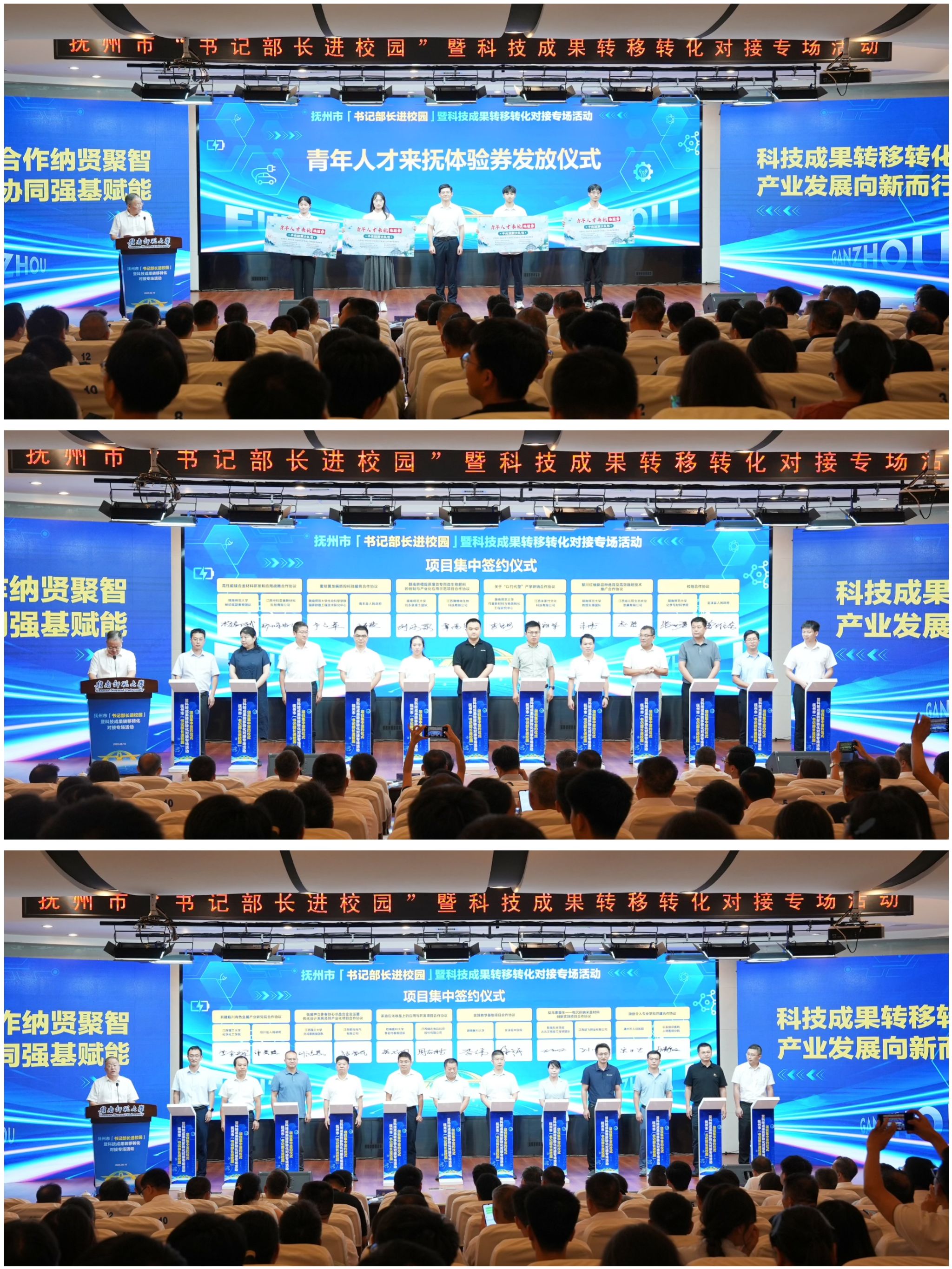 9月16日下午,抚州市“书记部长进校园”暨科技成果转移转化对接专场活动在我校图书馆科报厅举行。抚州市委书记、我校校友范小林致辞并推介,学校党委副书记刘民致辞,抚州市政府党组成员、副市长、抚州高新区党工委书记汪华辉主持。学校党委常委班子成员罗序中、甘雅芬、肖笃森、黄保文、叶云明,赣东学院副院长李勋出席活动。学校党政办、发展规划处、科研处、招生就业处、化学与材料学院、生命科学学院(脐橙学院)、智能制造与未来能源学院等部门和学院负责同志,抚州市相关单位负责人、企业代表,各有关高校高层次人才代表,赣南师范大学、江西理工大学、赣南医科大学学生代表参加活动。