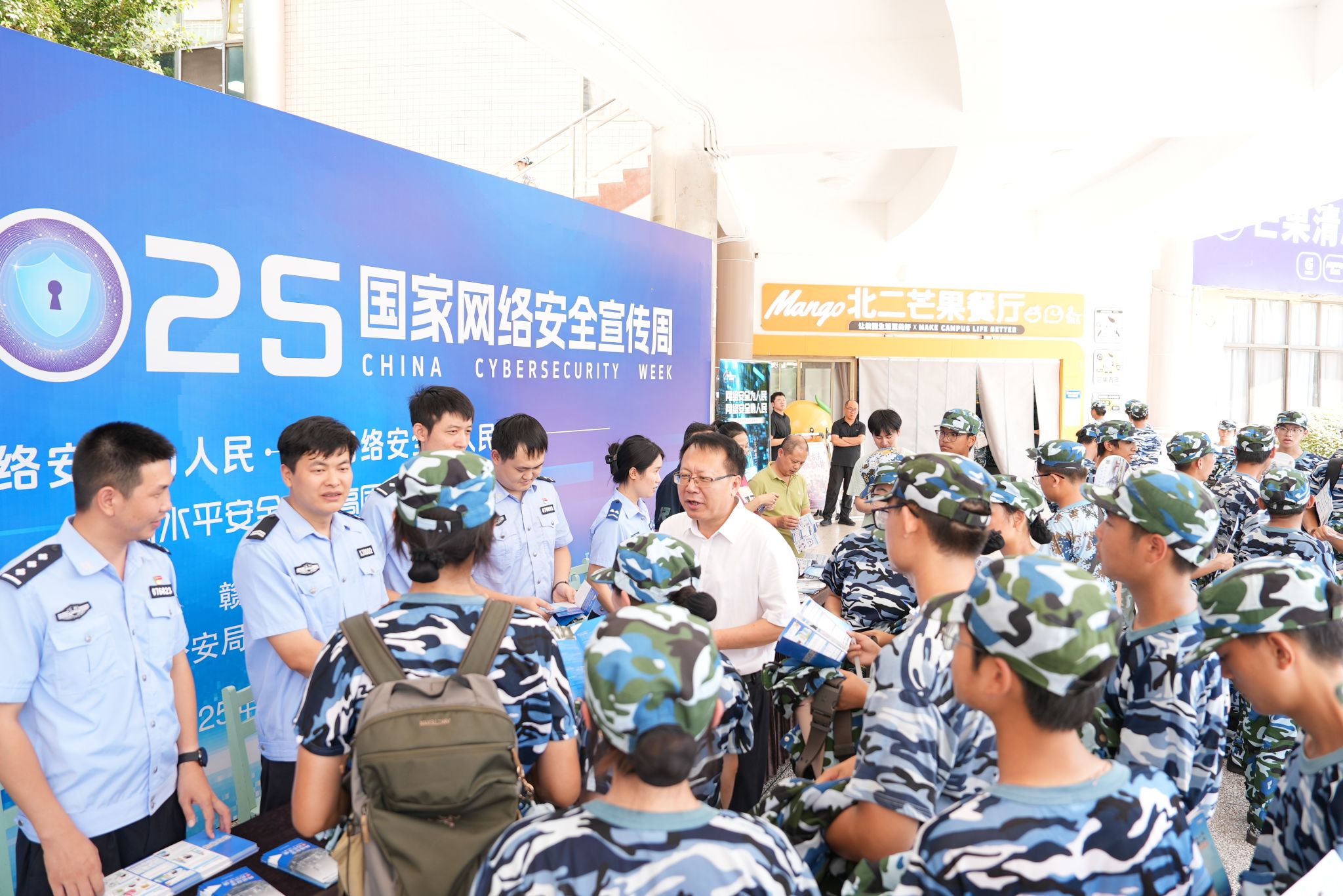9月16日校园日当天,系列特色活动集中开展。校园广场上的网络安全专题展览吸引众多师生驻足,赣州市公安局蓉江新区分局网安大队网警现场解读《网络安全法》《个人信息保护法》等法律法规,并发放宣传手册普及数据安全、个人信息保护等核心知识。刘民来到现场,与师生亲切交流网络安全常识,“同学们收到陌生链接不能随意点开?”“身份信息要保护?”在轻松互动的氛围中,同学们加深了对网络安全知识的理解。