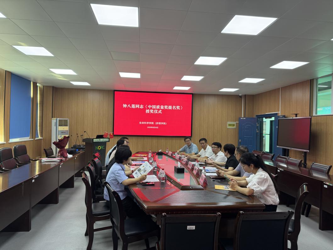 王宗德指出,中国质量奖提名奖是国家对质量领域创新实践的最高荣誉之一,钟八莲同志获此殊荣,不仅是个人的荣誉,更是学校服务地方产业、深化产学研协同的重要成果。
