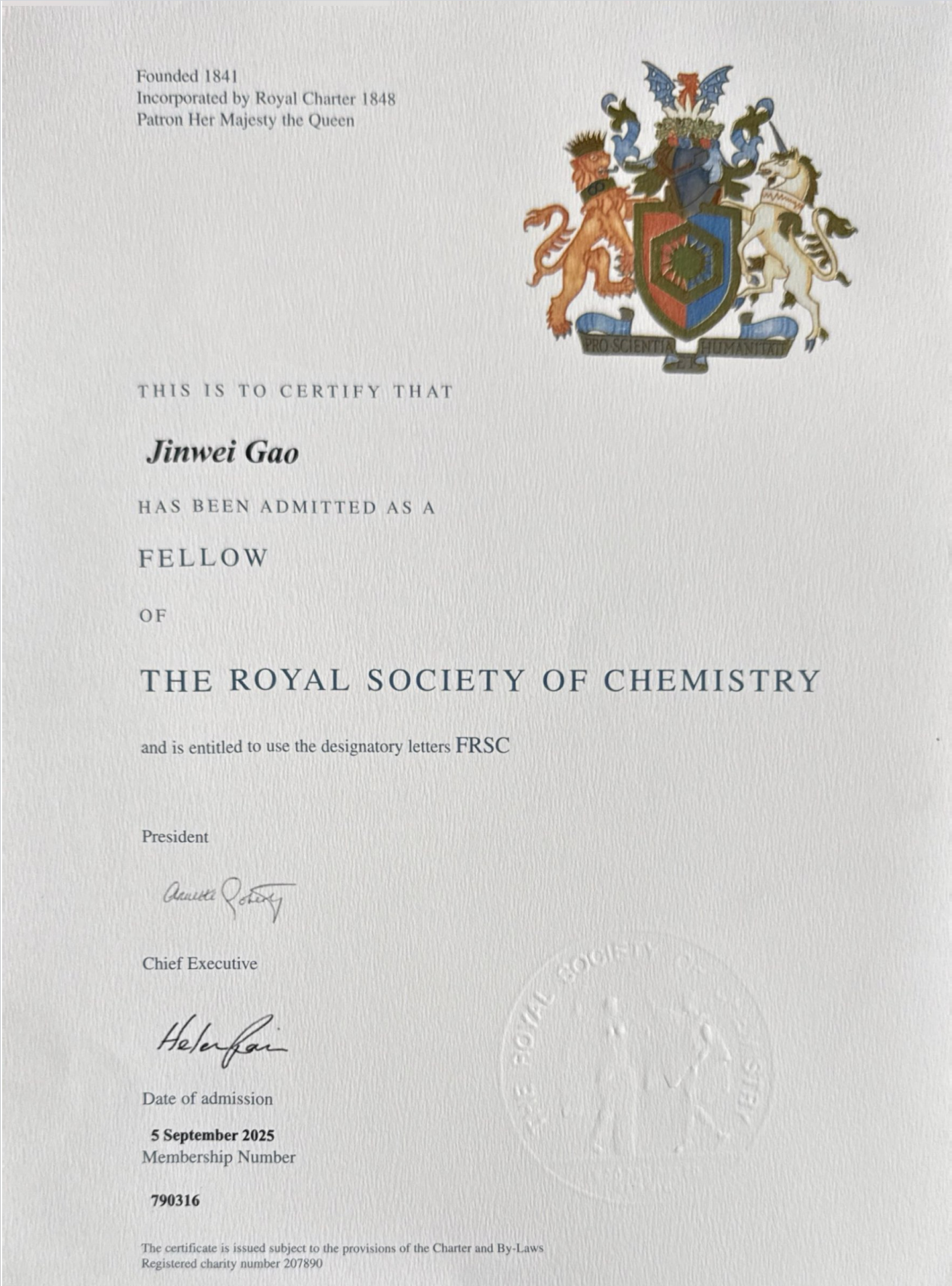 近日,智能制造与未来能源学院高进伟教授当选英国皇家化学会会士 (FellowoftheRoyalSocietyofChemistry,FRSC),以表彰其在化学科学领域的杰出贡献。