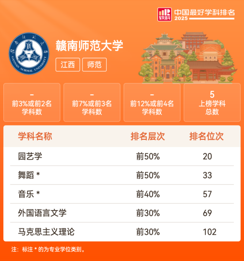 10月15日,高等教育评价专业机构软科正式发布2025“软科中国最好学科排名”,我校共5个学科上榜,较去年增加园艺学、舞蹈、音乐3个学科,其中舞蹈和音乐为今年软科排名新增一级学科。江西共13所高校上榜,我校位列第9位。