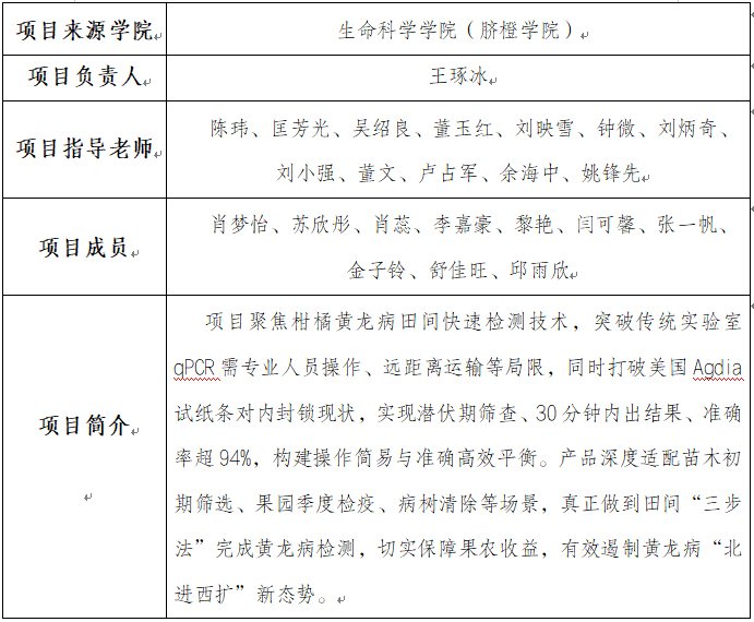 本次大赛,学校共有10885个项目报名参赛,报名项目数、参赛人数均创历史新高。7月,在江西省省赛中,学校取得4金13银38铜,获奖总数列全省第一。经过省赛选拔,学校共有11个项目入围总决赛。在激烈的网评阶段后,脐橙学院“环环相鉴——开启柑橘黄龙病即时检测新纪元”项目成功闯入总决赛金奖争夺赛。该项目负责人为2023级园艺学硕士研究生王琢冰,第一指导教师为陈玮博士,这是陈玮以第一指导老师的身份在该赛事上第二次荣获金奖,此次获奖,充分彰显了我校师生运用创新实践服务社会的能力水平,也是学校深化创新创业教育改革、深入推进“四新”建设、服务地方产业发展所取得的重要成果。