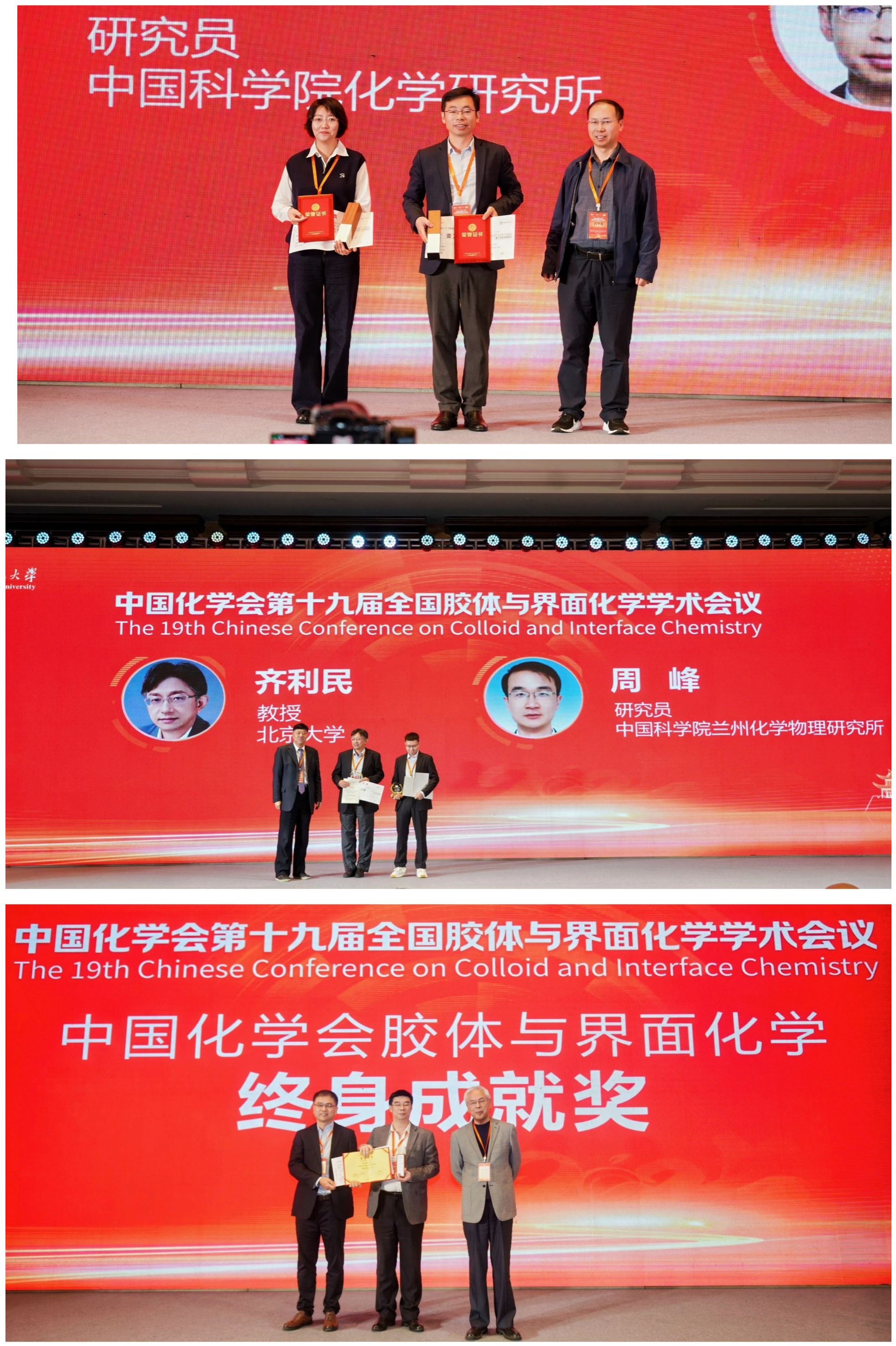 颁奖典礼随后进行,中国科学院化学所乔燕研究员、复旦大学李伟教授获中国化学会胶体与界面化学优秀青年学者奖,北京大学齐利民教授、中国科学院兰州化学物理研究所周峰研究员获中国化学会胶体与界面化学杰出贡献奖,北京大学朱步瑶教授获中国化学会胶体与界面化学终身成就奖。