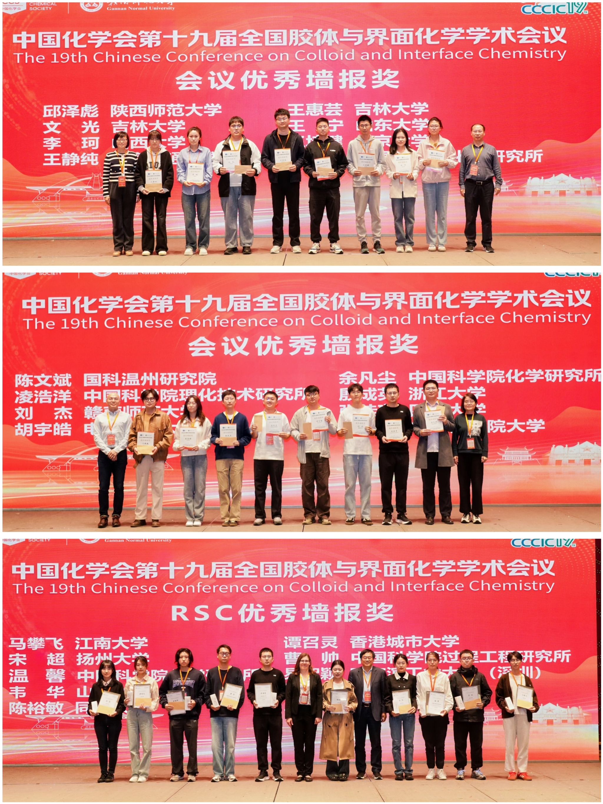 闭幕式表彰了26个优秀墙报,其中陈文斌、方鹏巍、龚雪峰、胡宇皓、李珂、凌浩洋、刘杰、邱泽彪、王宁、王惠芸、王静纯、王培键、文光、殷成英、余凡尘、张佳璇等16人荣获“中国化学会第十九届全国胶体与界面化学学术会议”优秀墙报奖,曹帅、陈裕敏、梁馨支、马攀飞、宋超、谭召灵、王真、韦华、温馨、易智颖等10人获“中国化学会第十九届全国胶体与界面化学学术会议”RSC Soft Matter优秀墙报奖。