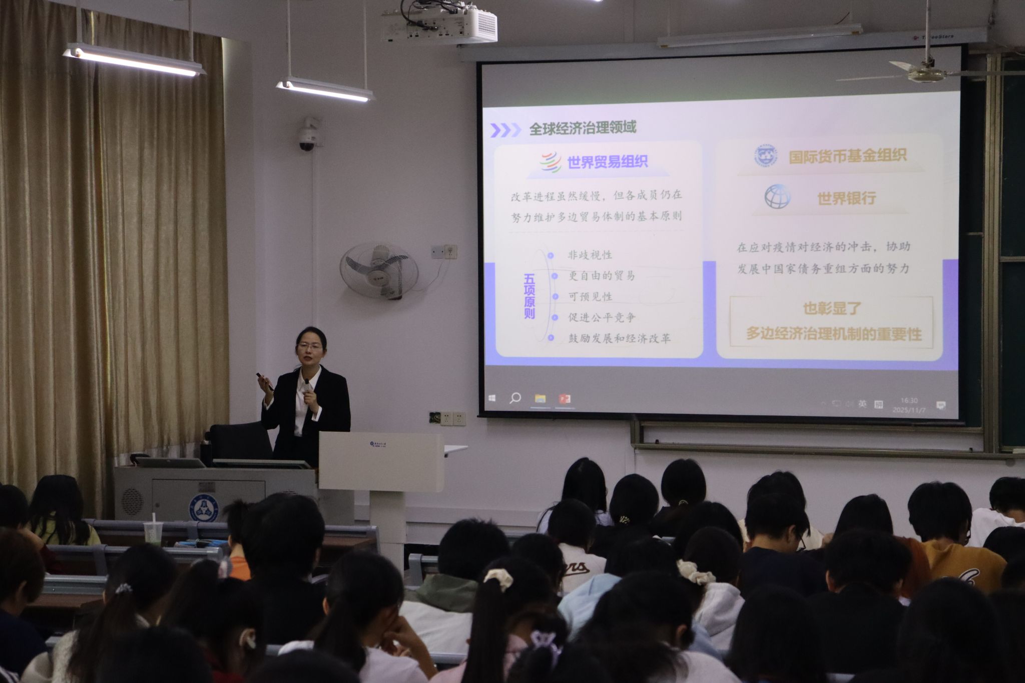 11月7日,学校党委常委、副校长甘雅芬为经济管理与法学学院2024级金融学和会计学专业本科生上形势与政策课。