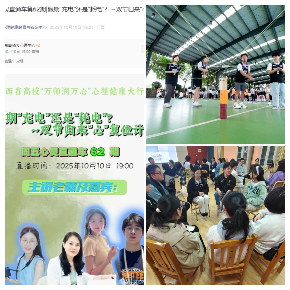 培养学生积极心理,开展“周五心灵直通车”直播、“咨询师说”微视频展播、“午后心茶”减压放松、心理健康团体辅导、525心理健康活动月系列活动,建设阳光校园。学生编演作品《心像追踪者》荣获江西省高校校园心理情景剧大赛一等奖。