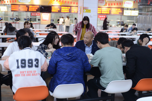 傍晚,陈义旺在北苑餐厅与学生共进晚餐,询问大家对食堂饭菜及校园管理的看法与建议。在温馨融洽的氛围中,与同学们畅谈心声。