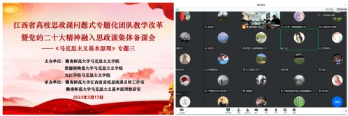 集体备课促交流,提升思政课教师素质。为贯彻落实教育部等十部门印发的《全面推进“大思政课”建设的工作方案》,落实省委教育工委、省教育厅关于高校思政课问题式专题化团队教学改革的工作部署,我校与景德镇陶瓷大学、九江学院联合主办全省高校《原理》课(专题三)问题式专题化团队教学改革暨党的二十大精神融入思政课集体备课会。上海师范大学马克思主义学院院长张志丹出席线上会议并点评,全国高校思想政治理论课教学展示活动特等奖获得者、广西师范大学马克思主义学院副教授梁红秀以“事物的普遍联系”为题作教学示范,我校马克思主义学院教授程东旺就专题三“为什么要用联系和发展的观点看世界”作专题示范备课。