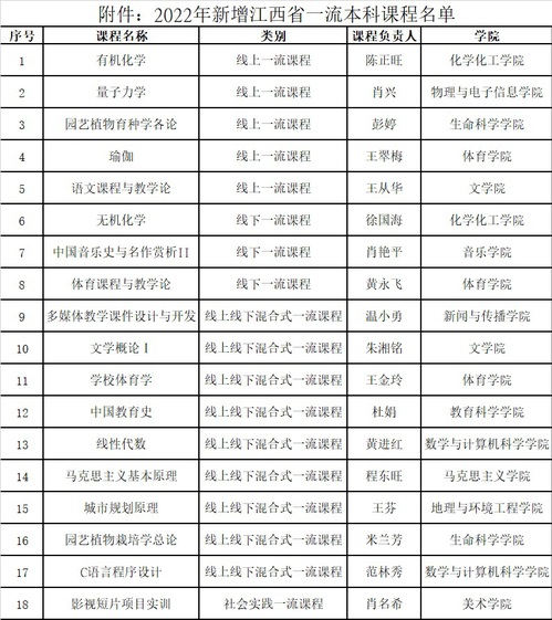 近日,江西省教育厅公布2022年江西省线上、线下、线上线下混合式、社会实践一流本科课程认定结果,我校共有18门课程被认定为江西省一流课程。其中线上一流课程5门,线上线下混合式一流课程9门,线下一流课程3门,社会实践一流课程1门。