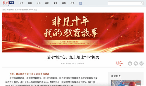 近日,由教育部宣传教育中心主办的“非凡十年·我的教育故事”宣传教育活动持续开展,该活动旨在深入发掘党的十八大以来教育改革发展变化,以主题深刻、真实生动的故事塑造教育品格,激发奋斗精神。我校国家脐橙工程技术研究中心建设发展故事,以及生命科学学院18级园艺专业学生舒佳旺的成长成才故事作为典型事迹入选,并被光明网刊载。