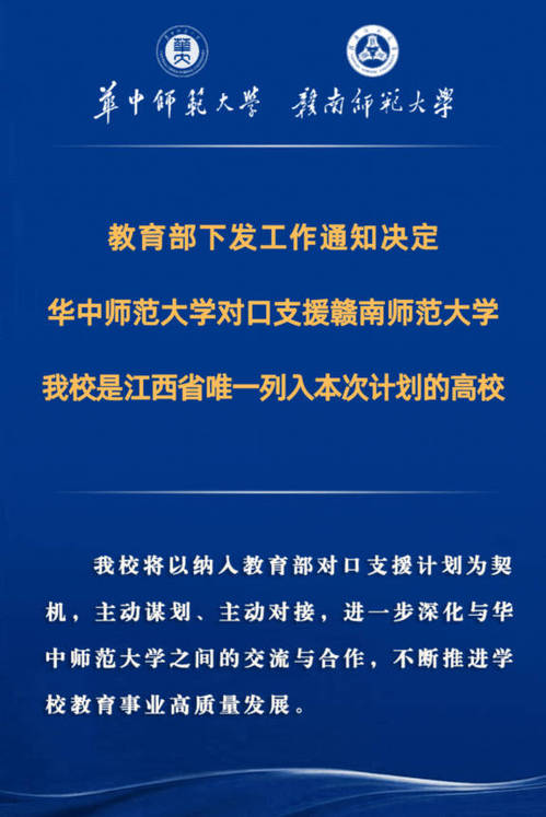 学校先后入选教育部师范教育协同提质计划重点支持院校、教育部对口支援西部地区高等学校计划(江西省唯一列入本次计划的高校)。“支持学校申报博士学位授予单位”正式写入《赣州革命老区高质量发展示范区建设方案》。