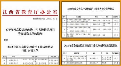 学校1个党支部入选第三批“全国党建工作样板支部”,入选的第二批“全国党建工作样板支部”顺利通过验收。成功申报并获批全国高校“一站式”学生社区综合管理模式改革首批自主试点单位,1个案例入选全国高校“一站式”学生社区风采展示活动优秀案例(全省仅3所高校入选)。1人获评“全国高校辅导员年度人物”(全省唯一)。意识形态工作年度考核位列全省高校第一,思想政治工作质量年度测评获A等级,在全省网络安全工作责任制考核中获优秀等次。获评江西高校思想政治工作省级精品重点培育建设项目2项(全省共15个)。在江西省思政课和红色文化课程教学比赛中荣获一等奖3项,一等奖获奖数列全省高校本科组第一。1个团队入选江西省高校思政课名师团队培养对象(全省仅2个)。通过复查,学校继续保留全国文明校园、江西省文明校园称号,同时获批赣州市文明校园。