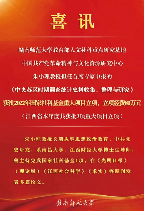 获批江西省首届“红色基因传承示范校”(全省共5个),获批全国红色基因传承研究中心重点课题立项1项。学术专著《红色政权立法(1927—1937):江西经验、历史贡献及现实意义》出版发行。获评“红色走读”优秀“云游”作品8个(全省并列第一),实地走读优秀团队作品二等奖和三等奖各1个,获红色动漫创作大赛一等奖1个,二等奖和三等奖各2个,优秀组织奖11个(列全省第1)。联合举办首届全国高校红色文化论坛,受到学界广泛参与和关注。