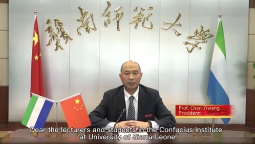 陈义旺向塞拉利昂大学孔子学院成立十周年表示祝贺。他指出,十年来我校塞拉利昂大学孔子学院从无到有、开拓创新,教学规模不断扩大、教学层次不断提升、教学点建设成果日益显著,在促进中塞多样文明交流互鉴、增进中塞两国人民友谊等多方面作出了卓越贡献,是中塞两国民心相通的桥梁。希望孔子学院继续勇立潮头,担负起中塞友好交往、人文交流的光荣使命,成为一张更加耀眼的文化名片。