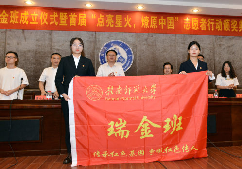 仪式开始前,刘民及现场师生全体肃立,向为中国人民解放事业和共和国建设事业英勇献身的烈士默哀,深切祭奠缅怀革命先烈。在随后举行的第十届瑞金班成立仪式上,刘民为新一届瑞金班授班旗,历史文化与旅游学院有关负责同志介绍瑞金班成员结构情况,宣读有关任命第十届瑞金班班委、支队长的决定。