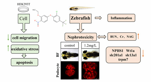 该研究以HEK293T细胞(人胚肾细胞)和模式动物斑马鱼为研究对象,评价了除草剂乙氧氟草醚在体内外的肾脏毒性作用。研究发现乙氧氟草醚的暴露可影响HEK293T细胞活性,引起氧化应激和凋亡。此外,乙氧氟草醚暴露会降低斑马鱼胚胎的发育,降低心率,并引起严重的炎症反应。还可引起肾小球足细胞和肾小管细胞脂质过氧化造成器质性病变,影响正常肾功能。进一步研究发现,在紫外线照射下,乙氧氟草醚的毒性作用会大大增强。在生物放大和生物积累的作用下,乙氧氟草醚最终可能危害人类,特别是有潜在健康问题的人。这项研究为了解乙氧氟草醚对水生生物安全性和人类的健康风险提供了新的见解。
