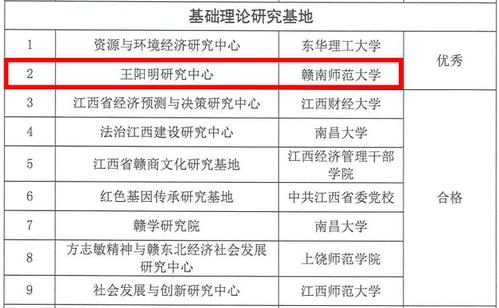 近日,江西省社联公布了省哲学社会科学重点研究基地周期考核评估结果,我校2个研究基地全部通过考核,其中王阳明研究中心获得基础理论研究基地类优秀等次。据悉,此次共有36个基地参与评估,7个基地获得优秀等次,其中2个为基础理论研究基地。