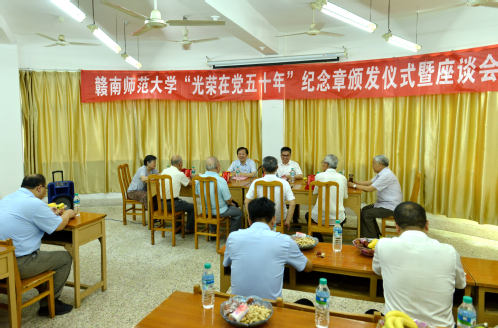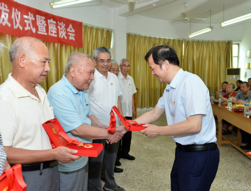 6月28日,学校举行“光荣在党50年”纪念章颁发仪式暨“庆七一”老同志座谈会。学校党委副书记、校长朱小理出席并讲话,党委委员、副校长邱小云主持仪式。何明、刘瑞桂、郑翠姣、李贤海、曾昭贵、谢能武等六名“光荣在党50年”老党员,校党委委员、组织部部长肖笃森,党委委员、宣传部部长左群,党委(校长)办公室、离退休工作处等部门负责同志,离退休党委各党支部、各协会有关同志参加。