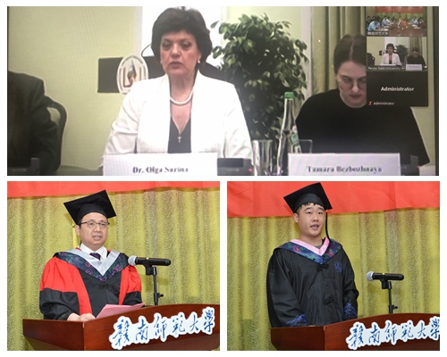 6月8日下午,我校与俄罗斯奔萨国立大学2022届中外合作办学项目毕业生毕业典礼在音乐学院举行,校长朱小理,副校长邱小云,俄罗斯奔萨国立大学副校长辛佐夫·格列布、副校长谢尔盖·米哈伊洛维奇出席,学校有关职能部门负责人、俄罗斯奔萨国立大学有关领导教师代表,音乐学院党政负责同志、教师代表以及音乐学(中外合作办学)2022届在校毕业生参加。毕业典礼采取“现场+线上”的方式举行,俄方学校代表通过线上会议的形式参加。