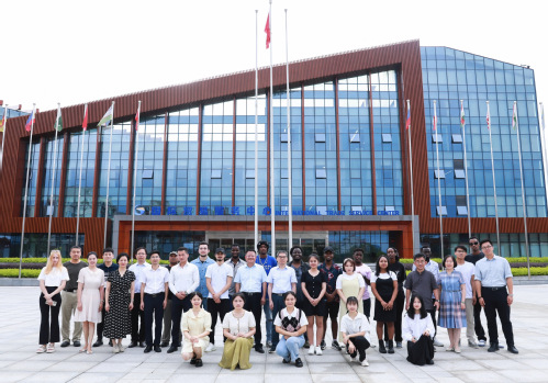 邱小云一行途经赣州国际陆港铁路场站,大型龙门吊正在有序作业,一排排五颜六色的集装箱整齐排列,货车来来往往,中欧班列整装待发,师生们对眼前的繁忙景象赞叹不绝。在龙泰安冷链物流产业园,大家对冷链、物流、仓储、加工、贸易、电商、金融等全产业链一体化有了直观认识,还在负责人的带领下进入冷库,真正地感受了一把冷链的“冷”和“鲜”。在国际木材集散中心,结合去年参观“家居小镇”的见闻,师生们更深入地了解了赣州国际陆港“无中生有打造开放平台,港通天下助推苏区振兴”的产业发展奇迹。来到进出口商品展示交易中心,当看到货架上摆放着来自自己国家的商品时,留学生们兴奋不已,纷纷合影留念。