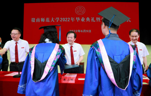 典礼结束后,学校举行2022届毕业生学位授予仪式。各学院院长为获得学位的毕业生整理学位服,校领导为毕业生拨穗正冠、送上祝福,朱小理逐一为毕业生授予学位证书,并与每位同学合影留念。