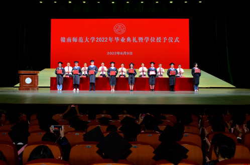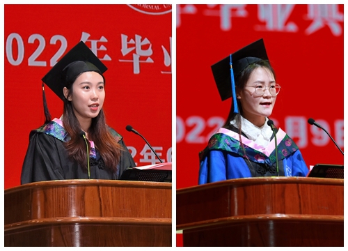 新传与传播学院2022届播音主持专业许济凡同学、经济管理学院2022届金融学专业段可仪同学,分别代表毕业本科生、毕业硕士研究生发言;化学化工学院青年教师周中高博士作为教师代表发言,教育科学学院2022届小学教育专业严丽霞同学父亲严之经先生作为家长代表发言。