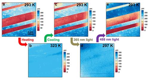 鉴于此,王仲夏首次发现并报道了一对单一手性单组分有机铁电体/铁弹性体,它们不仅表现出与温度相关的热力学铁电/铁弹性相变,而且还表现出烯醇-酮光异构化触发的光驱动铁电/铁弹性相变。最为重要的是,铁性畴在初始状态与可逆相变后的最终状态完全相同(图1)。该工作发现的热和光多通道控制铁性畴记忆效应将为智能铁性材料开辟一个全新的研究领域。